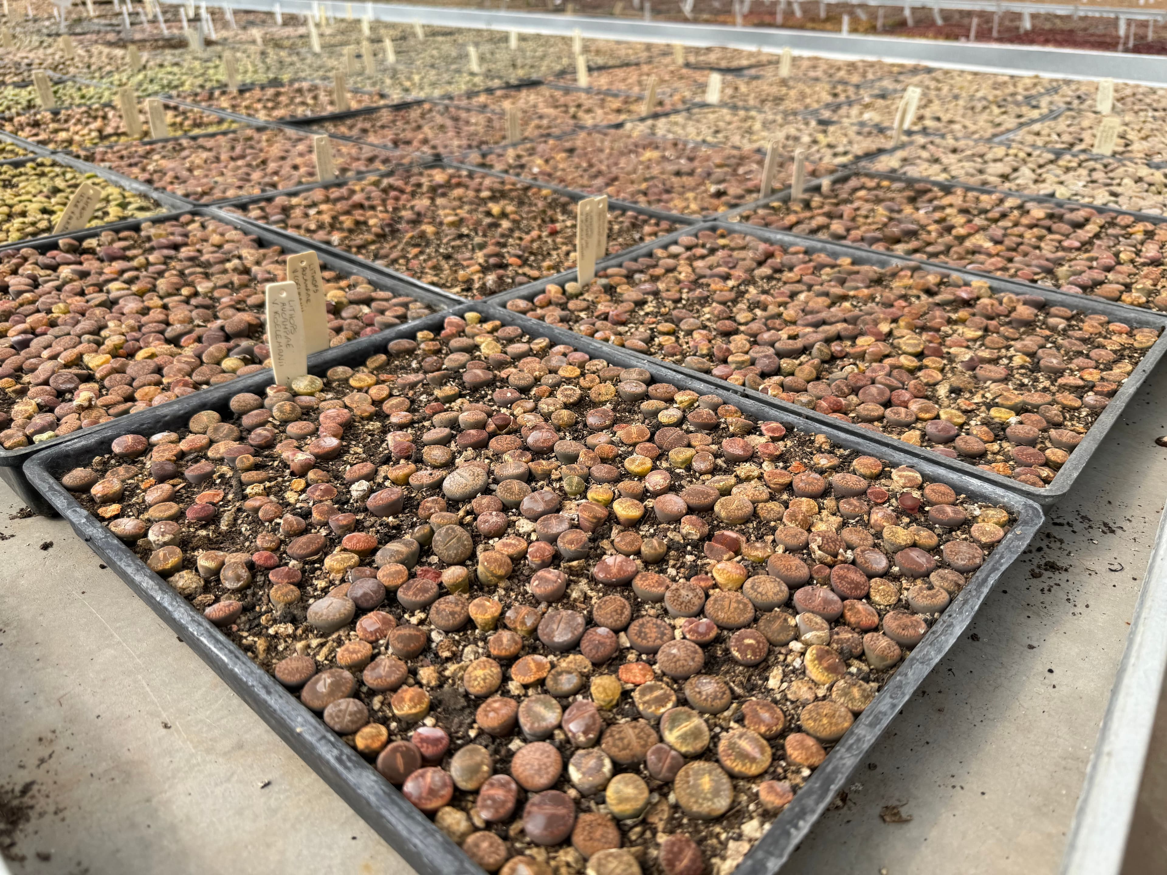 As “plantas-pedra” sempre despertam curiosidade, e o Cactário Horst mantém uma bela coleção delas. Cultivadas em bandejas com dezenas de exemplares, mostram toda a variedade de cores e formas que essas pequenas suculentas podem ter.